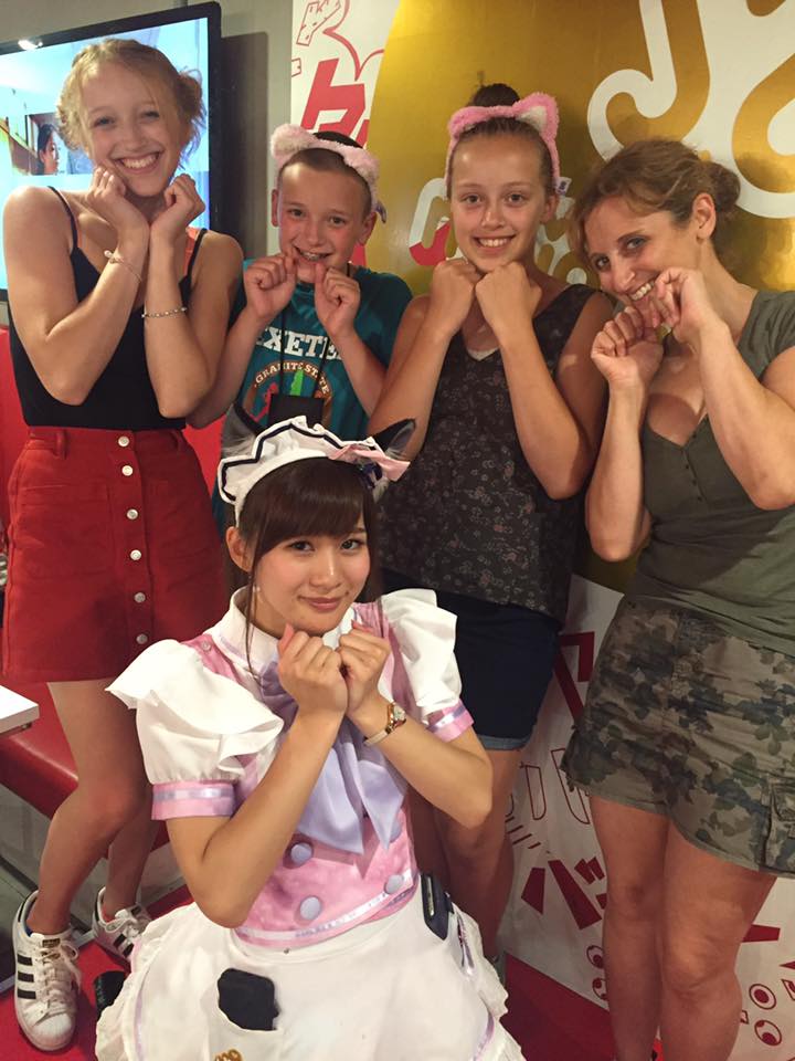 I stayed at a cute place called Dormy Inn. The room was tiny but cozy. After I checked in, I ventured out shopping. All along the streets are ladies in cosplay-style maid costumes, handing out flyers for the various maid cafes. On the first trip to Japan, our tour included a trip to a maid cafe. See throwback picture below. The one we went to was very kawaii (cute) – the kids and I got ice cream sundaes and took pictures with the maids. I’m sure not all are like that – it’s a strange concept.
