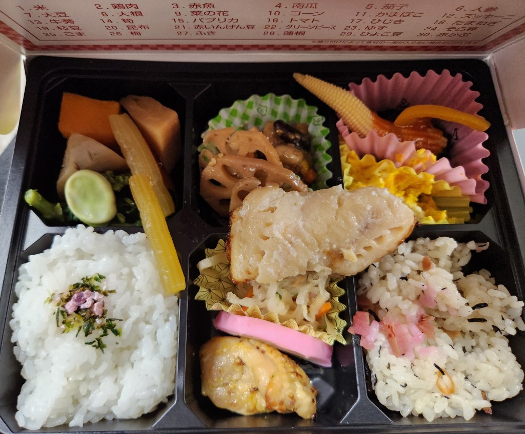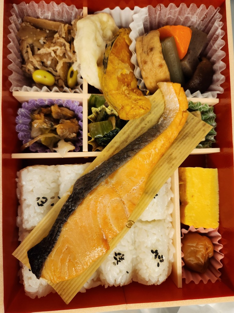 Lowkey morning and then took the Shinkansen to Osaka. I got to the station early to try to find the elusive vegetarian ekiben (train station bento box). It was not to be found (the response was an unequivocal “nai!” with hands crossed). Finally I just asked for a bento with a lot of vegetables and was directed towards one that was mostly seafood and veggies – perfect! There was tempura pumpkin, konnyaku (a gelatinous food made from a certain type of potato), two types of tofu, boiled veggies, tamagoyaki (sweet omelet), pickled plum, clams, silver salmon, and rice.