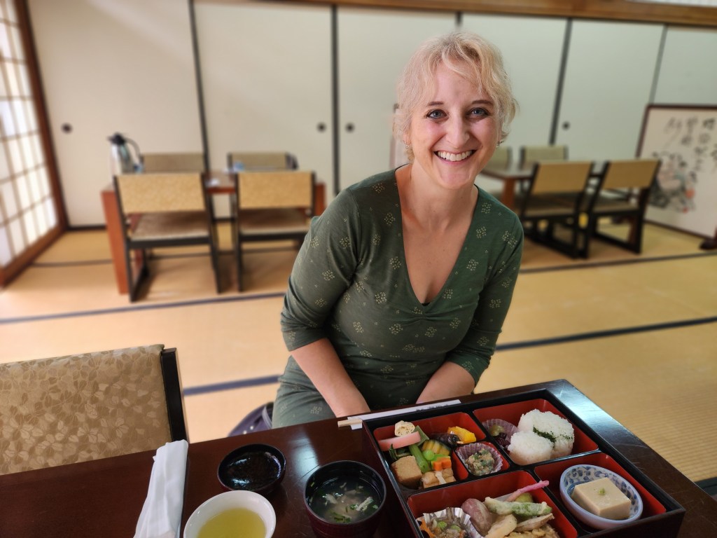 Saori had made a reservation for a Fucharyori (vegetarian cuisine that was brought to Japan from China by a Zen master) lunch. We sat diagonally across from each other in a room that was set up to serve this cuisine. Lunch was served in a bento box. The food was made with seasonal vegetables and tofu, with each piece cut perfectly. I think this might have been the best meal I have ever had in Japan.
