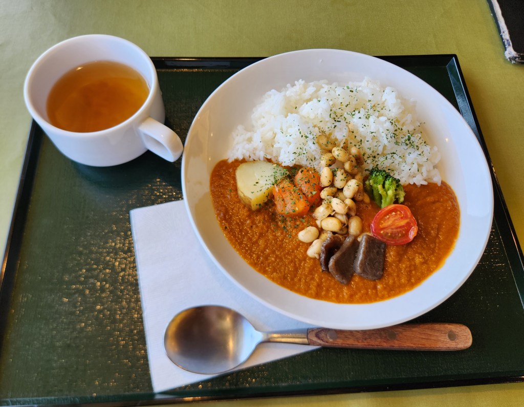 From we visited Kamakura Hasedera temple and the Kannon museum. We had been walking a lot at this point and there were many staircases up to the temple, so we decided to get out of the sun and have an early lunch at a vegetarian restaurant next to the temple. I had one curry rice and vegetables – one of my Japanese comfort food favorites – and onion broth. We had a beautiful view from our table, and we were able to spend some time catching up.