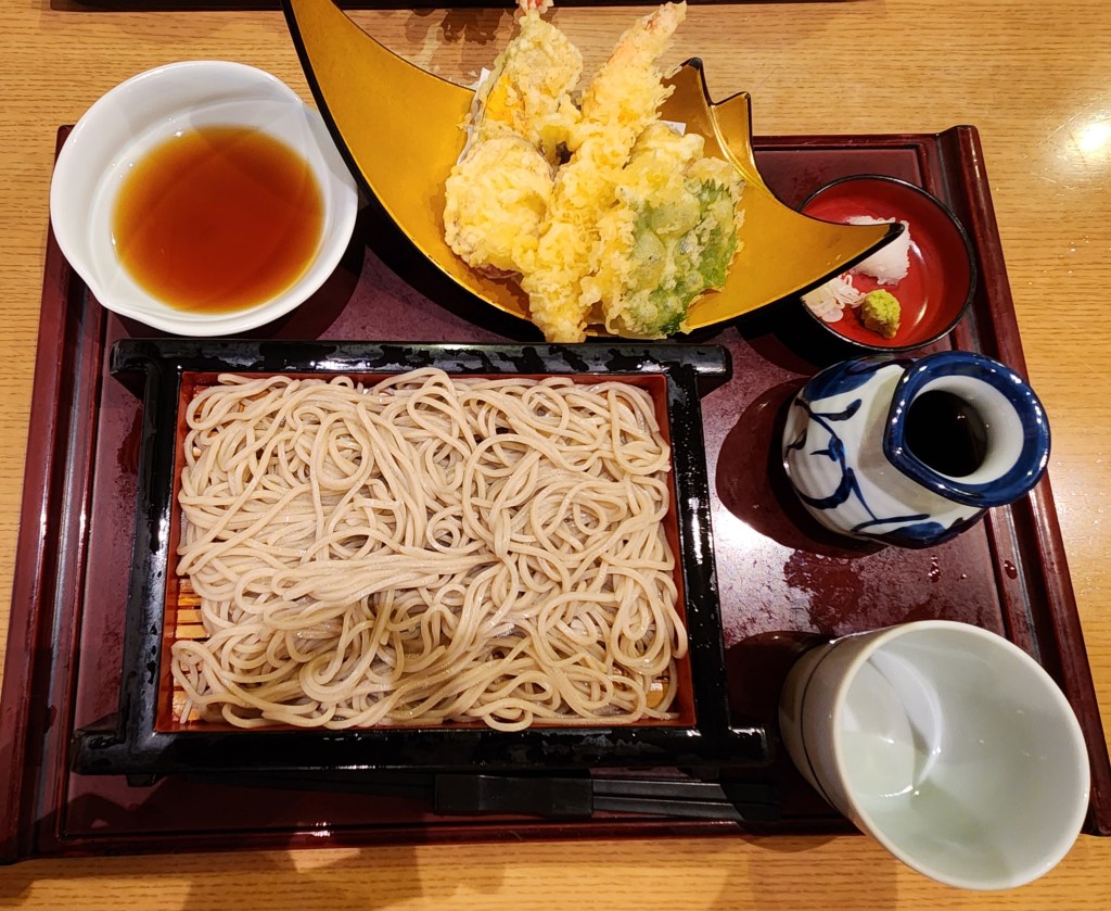 We were both hungry and it was past lunch time so Mariko took me to a soba restaurant. We both ordered tempura soba. Buckwheat noodles with a dipping sauce and condiments to add to it: wasabi, daikon radish, and scallions. The vegetable and shrimp tempura had it’s own sauce, also delicious. The server also brought a pot with broth from the soba noodles. After we finished eating the noodles, we poured the broth into what was left of the dipping sauce, to make a soup.