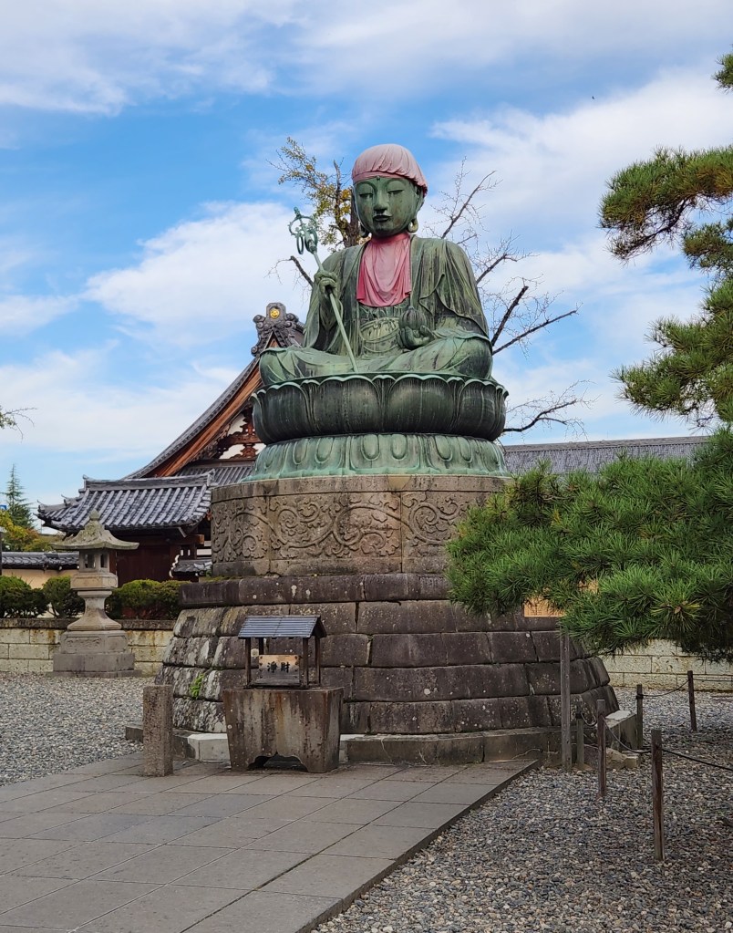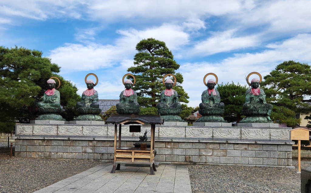 We stopped to see a set of six statues called the Rokujizo. They are bodhisattvas who save people in six realms: gods, demi-gods, humans, animals, hungry ghosts, and hell denizens. To the left of them is a larger statue of Nure Botoke, a seated bodhisattva meant to protect the temple from fire.