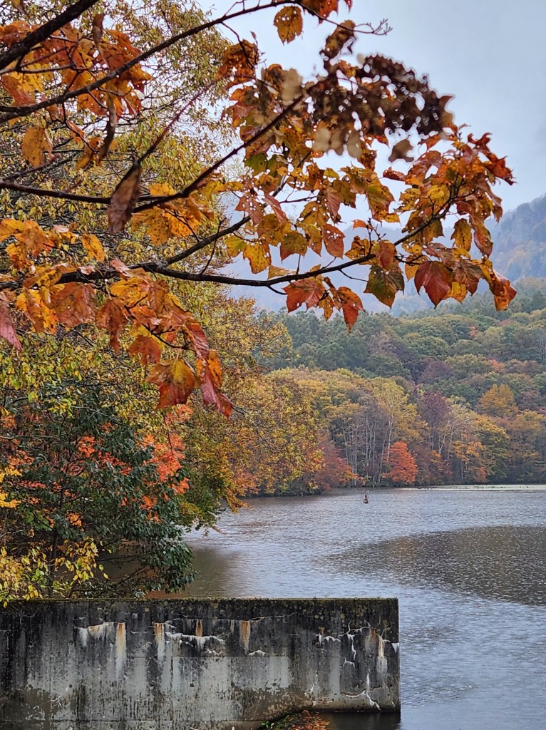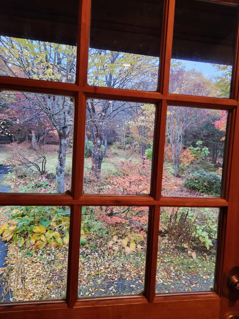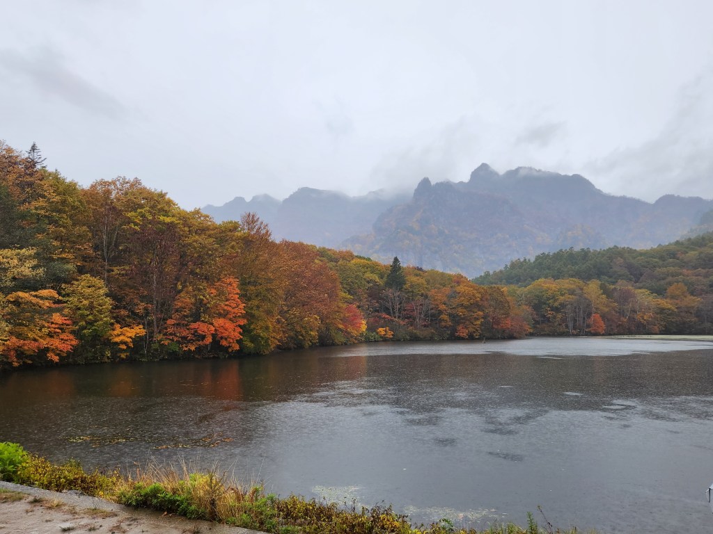 Around 3 in the afternoon, we left for Mariko’s parents’ inn, Pension Azalea. It is about an hour drive up into the mountains. The roads are narrow and windy, but the views are spectacular. The autumn leaves were further along the higher we got. On the way, we stopped at a popular spot for photos and autumn leaf viewing, Kagami-ike Pond. It was raining at this point but we had umbrellas so we walked around a bit and took some photos. There was a mist/fog so we couldn’t see the rocky part of the mountains, but the trees and pond were beautiful.