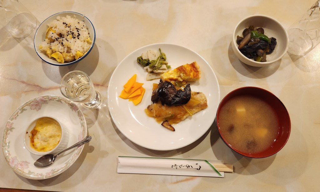 After our snack, I put on an apron and helped with prep cook, cleaning and serving for the 7 guests who were staying there. Mariko’s mom not only cooks delicious food, but makes it look beautiful. After the guests dined and left, I helped clean up, prepare our dinner and prep food for the next morning. Then it was time for us to eat.