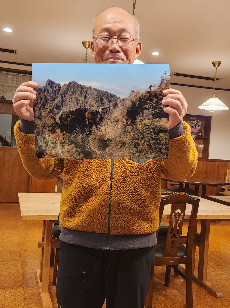 It was a lovely dinner with fun conversation. Mariko’s father used to be a mountain guide for hiking and climbing. He showed me a photo of the mountain near Kagami-ike that he used to climb almost every day. There is a knife-edge part of the trail, and in the photo you can see a climber on it. I asked him if I could take a picture of him with the photo.