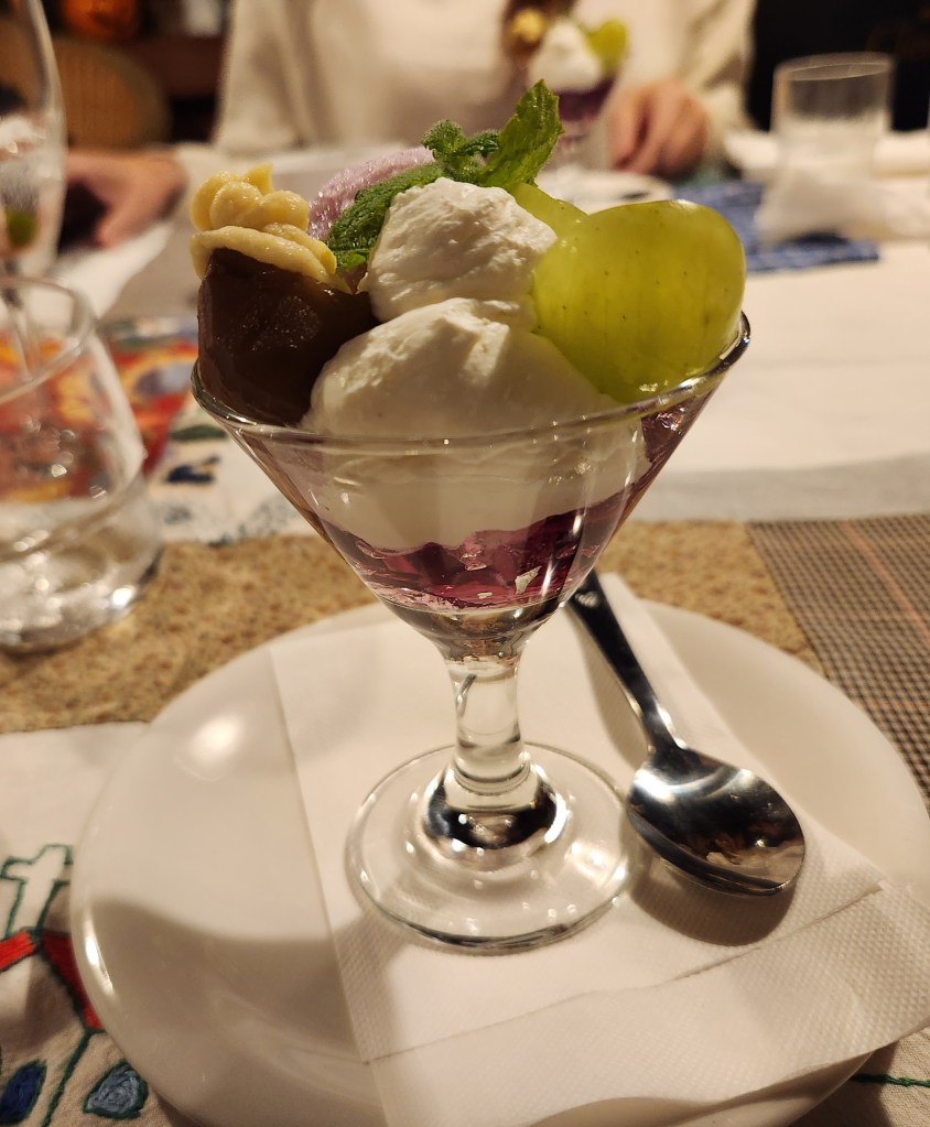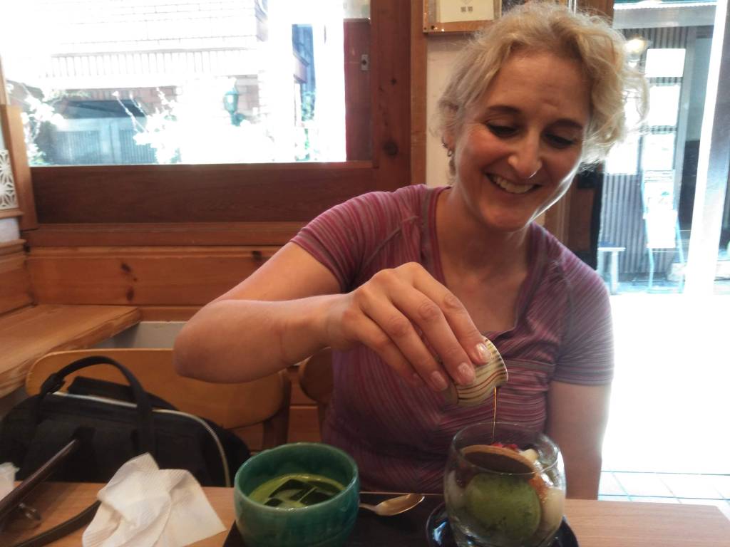 In the afternoon, Mariko and I went back to Nagano city so I could purchase my shinkansen ticket for the next day. We picked up her daughter as well and headed back towards the inn. On the way we stopped at a park alongside a pond so Mariko and I could do a power walk before dinner. For dinner, we went to a restaurant owned by close family friends of Mariko. The restaurant is called Haricot Rouge and has a European / Japanese fusion style, similar to Mariko’s mom’s cooking. We shared cheese souffle and I ordered vegetable risotto with fresh local veggies. Koba-chan, the cook and close friend, brought us a special dessert with matcha ice cream, whipped cream, maron (chestnut) puree, grapes, mochi and grape jello. It was beautiful and delicious. I chatted with her for awhile and we took some pictures. She and her husband are lovely, kind people.