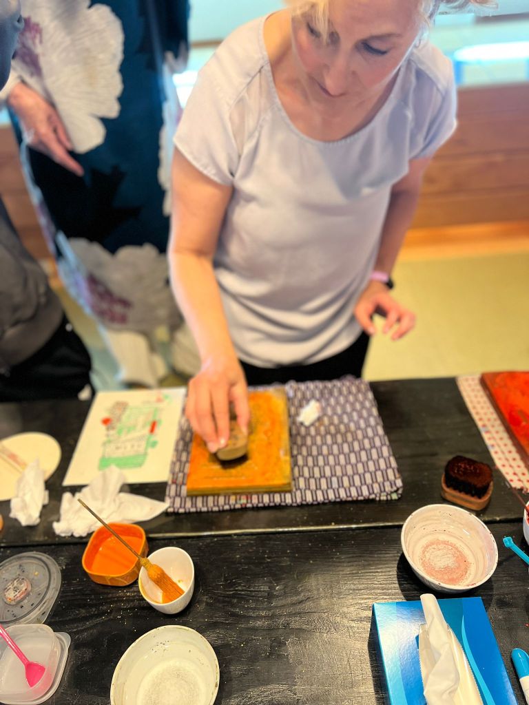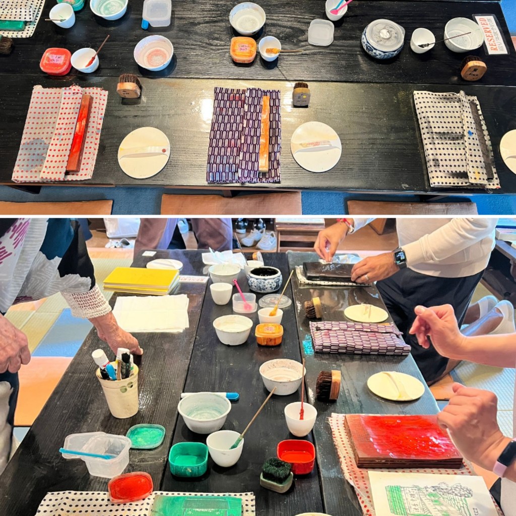 Kamigata Ukiyo-e is a very small museum containing mostly woodblock prints of famous Kabuki theater actors. There is a larger Ukiyo-e museum in Osaka, but I chose this smaller one because they offer a hands-on workshop where you can practice inking carved woodblocks and making a multi-color print. I have done some woodcut and linoleum printing but the process for making the Ukiyo-e style prints is much more elaborate. The woodblocks themselves are different from the blocks I’ve carved for my simple, one-color prints. Ukiyo-e prints have very fine detail so the wood used has to be very hard to hold the detail. Multiple blocks must be carved in order to do a multicolor print. This short class didn’t cover the block carving, but simply gave the students an opportunity to ink the blocks and create a print, which by itself is not as easy as it sounds!