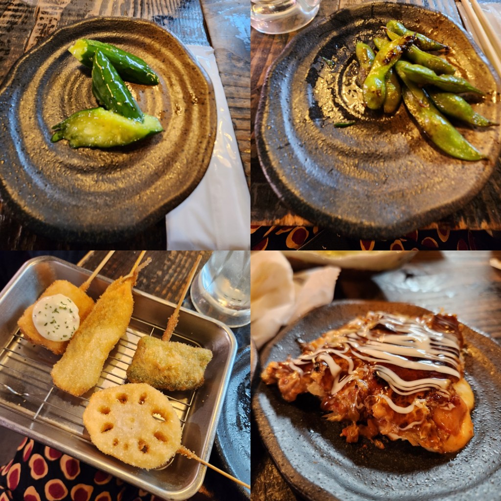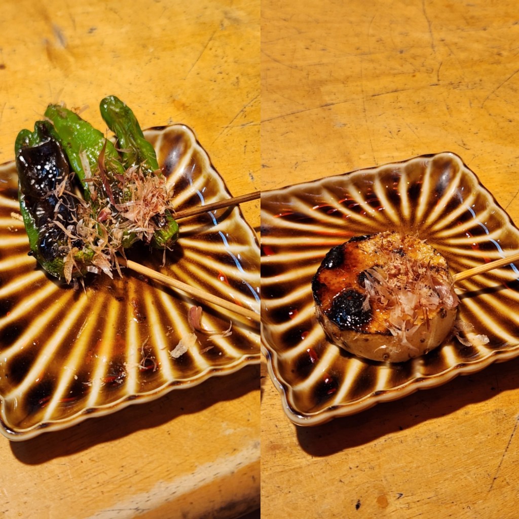 In one of the buildings there is a “food court” with several tiny bars in the same indoor space. We had course after course of bar food: a light, crunchy pickled cucumber, edamame sautéed in butter, kushikatsu (fried food on a stick – for me it was shishito peppers, burdock root, salmon, and kisu fish), okonomiyaki minus the meat, and a sampling of nigiri sushi. This time I tried a yuzu chuhai instead of beer, which was very refreshing. The food was amazing and we started bar hopping after that.