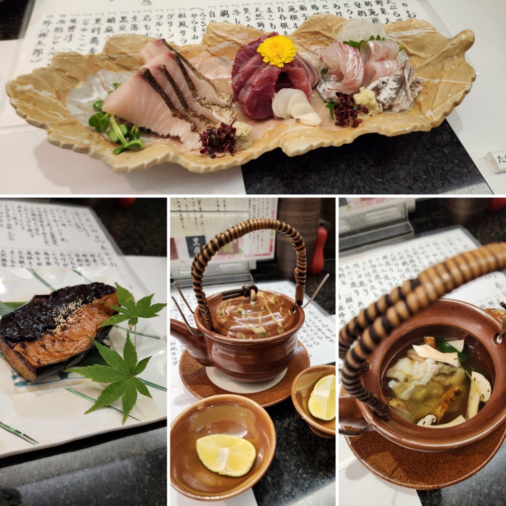 By now, the clouds had turned to drizzle. We were both tired from walking so we went to a small izakaya near in Saori’s neighborhood. Saori ordered sashimi: mackerel, katsuo and tai. Then roasted eggplant topped with two types of miso. Cold sake. Soup with sudachi (a Japanese citrus fruit).