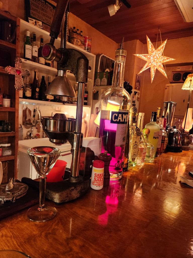 I walked down one of the alleyways and stopped at a tiny bar/restaurant called “Smiley Smile”. There were 2 seats outside, 4 at the bar, and a tiny table in the back of the bar. There were a few special drinks written on a blackboard so I ordered one of them, a paloma. Behind the bar were a couple of shelves of liquor, a tiny stovetop, a small sink, kitchen utensils hanging up and a small refrigerator. The owner grabbed a half a grapefruit out of the fridge, squeezed it fresh using a juicer on the bar counter and then mixed my drink, which was lovely.