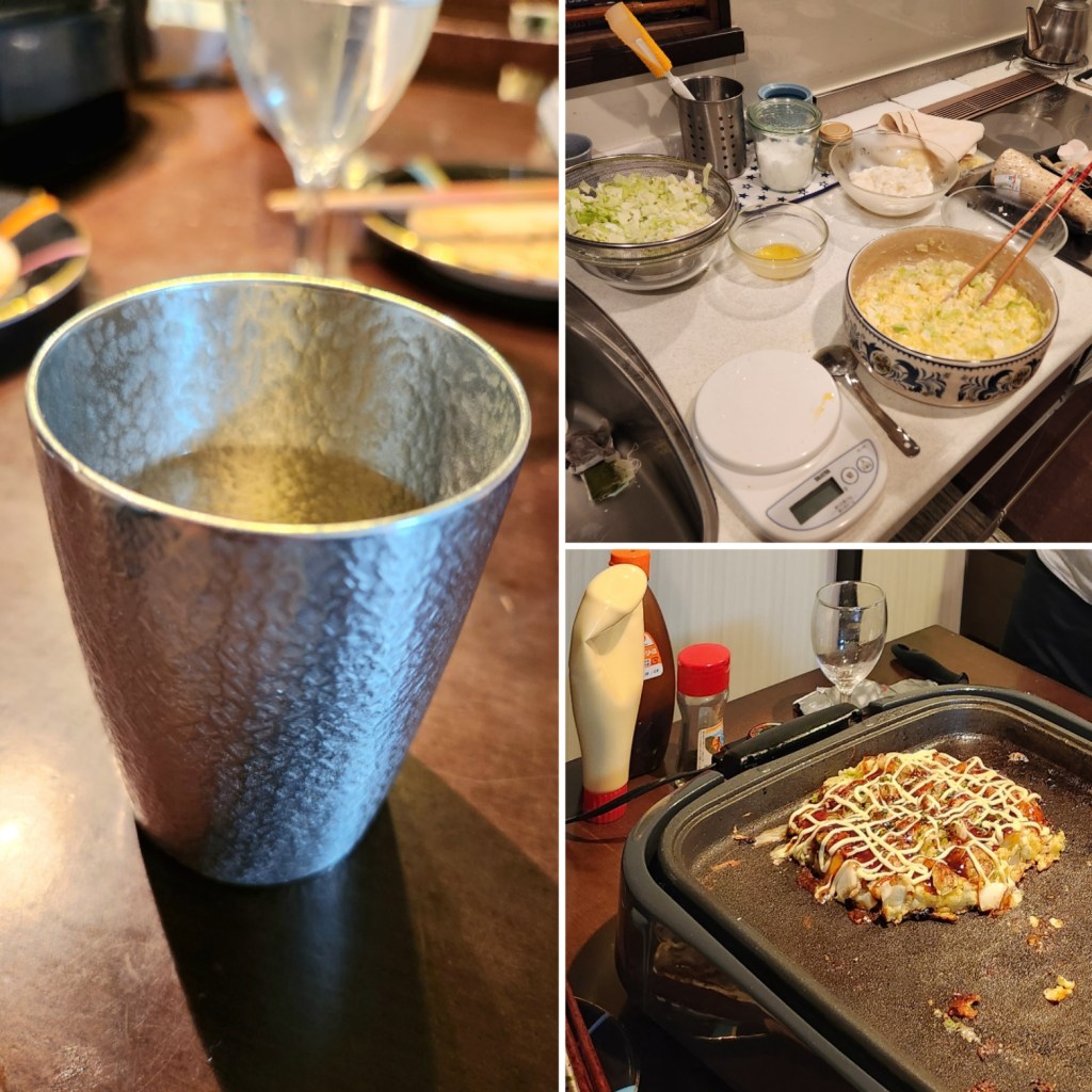After stopping at Mariko’s house for tea with her daughter, the three of us ventured to the supermarket for dinner ingredients. Seafood okonomiyaki was on the menu! I helped with the food prep under Mariko’s guidance: chopped cabbage, grated sticky potato (this was a new one for me!!), mixed seafood (ebi/shrimp and kai/shellfish), egg, tempura bits, flour, dashi, and soy sauce. Mariko’s brother arrived to join us, and Mariko’s husband returned from work and did the actual cooking of the okonomiyaki pancakes. We set up a griddle on the dining table so we could eat and drink and talk while the pancakes cooked. The pancakes are topped with aonori (seaweed), bonito, okonomiyaki sauce, and kewpie mayo. It was absolutely some of the best okonomiyaki I’ve ever had. Totemo oishikatta!!