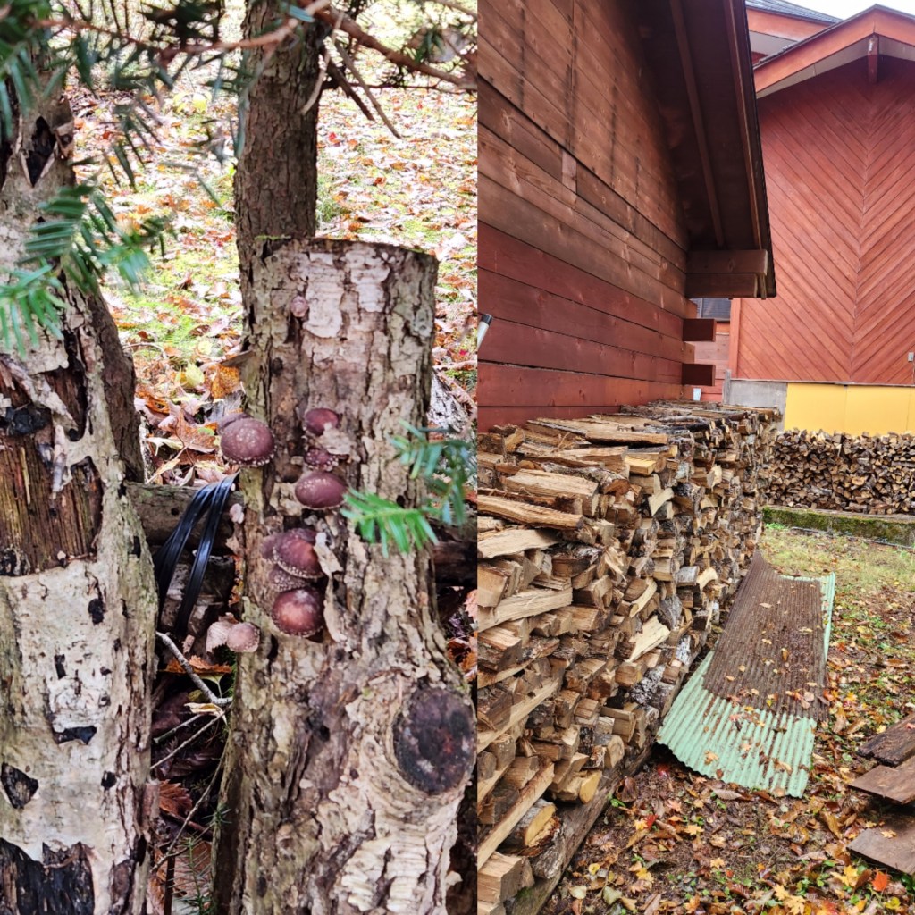 The last couple of days in Nagano were just lovely. On Saturday, we had a delicious breakfast at the inn and I took pictures of birds coming to the feeder outside the dining room window. We spent some time helping with the kitchen cleanup. Then Mariko and I walked around outside. She showed me the huge pile of wood that her dad split, which made me think of my dad. I took a picture to show him later. She also showed me the “mushroom farm” – birch logs where they grow kinoko that her mom uses in the dishes she makes at the inn.