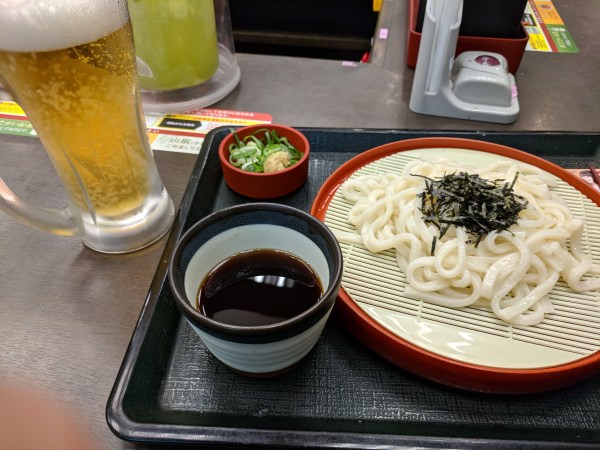I wandered around the area and found a small restaurant that looked good. I went in and tried to sit at the counter and was directed to what looked like a vending machine with a touch screen display. I realized that you order and pay ahead of time. The display was entirely in Japanese, but fortunately there were pictures. I ordered a beer and udon – my staple.