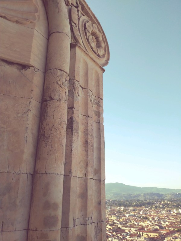 After walking around part of the circumference we went back into the network of stairs. At this point the path goes between the inner and outer domes and then up to the cupola on top. I was afraid to go up the last bit to the exposed area in top so I hung back and waited, while Sarah ventured up. A kind man stopped to talk to me on his way down. He assured me that there was room to move around away from the edge. He said, “you came all this way, maybe just try a quick look?” That convinced me and I climbed the last stairs and gingerly stepped out onto the top of the dome. The view was stunning. I have no photos because I was clinging to the stone wall at the center to get as far away from the edge as possible. I looked out, I breathed, I found my sister, and then I went back down to wait for her. She sent me a couple of her photos to add.
