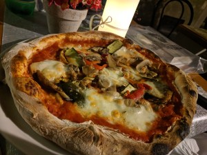 We sat at a restaurant outside. I got a vegetarian pizza and a glass of wine.