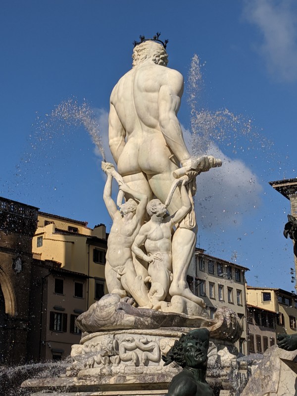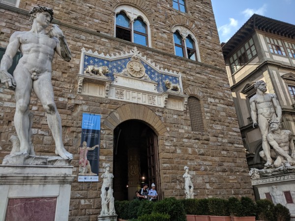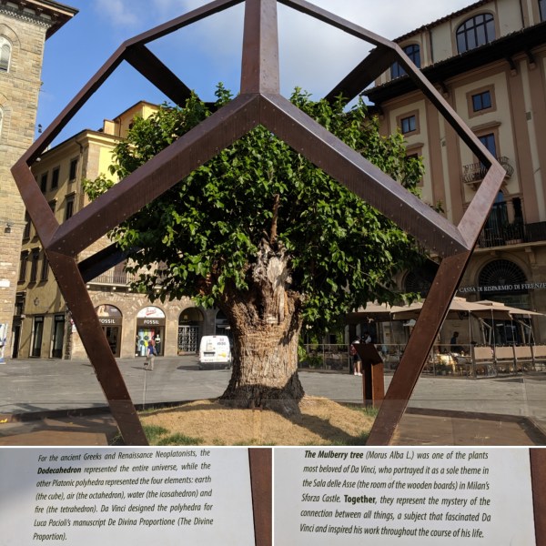 In the square there is a replica of David, Poseidon fountain, Perseus holding Medusa’s head, several sculptures of the Rape of the Sabine Women, Hercules fighting the centaur, Menelaus & Patroclus. A more modern looking sculpture, a dodecahedron tribute to da Vinci, is a strange contrast next to the older, traditional sculptures.