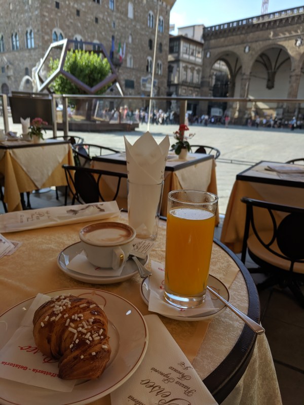 Today we had a full itinerary planned starting with breakfast at Piazza della Signoria. Brioche, cappuccino and fresh orange juice while looking out a the piazza.