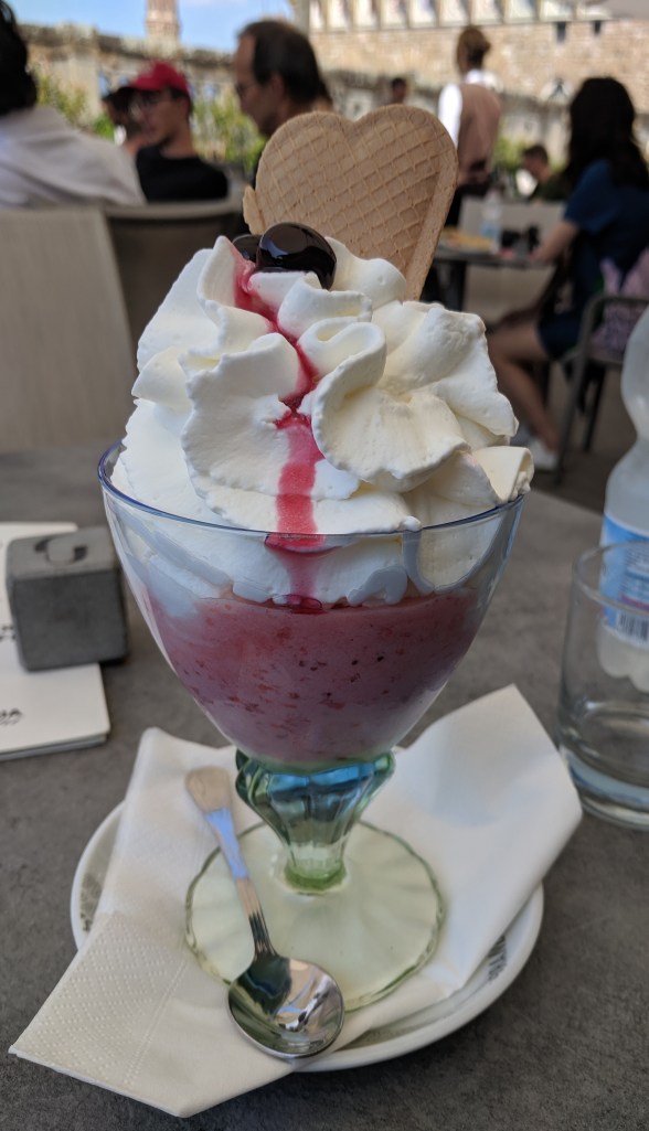 After I had walked all the floors, I made my way to the cafe and sat outside at a table in the shade. I treated myself to Gelato .. a huge bowl of lemon, strawberry and vanilla topped with whipped cream and cherry sauce.